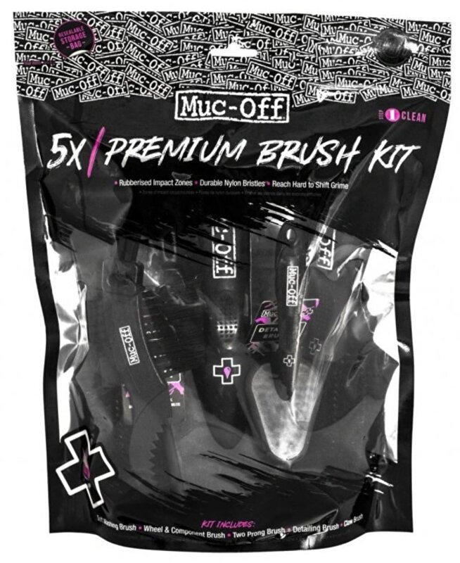MUC-OFF 5X BRUSH SET je sada kartáčů určená k čištění rámů a všech jednotlivých částí jízdních kol, včetně těch s choulostivým povrchem.