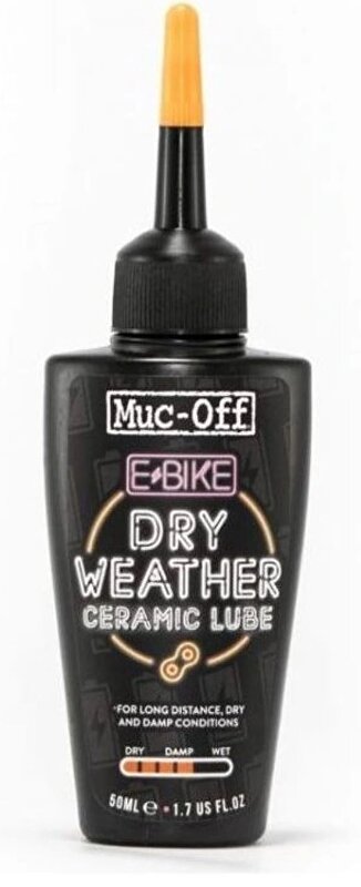 MUC-OFF EBIKE CERAMIC DRY LUBE na bázi keramických nanočástic a sloučeniny nitridu boritého zajišťuje nízké tření řetězů elektrokol v suchých a prašných klimatických podmínkách. Toto mazivo bylo vyvinuto speciálně pro mazání řetězů s vyšším točivým momentem, který elektromotory ebiků vyvíjejí.