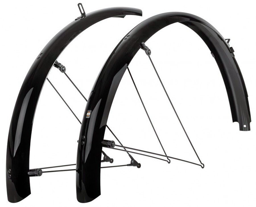 Černý set blatníků na kola 27,5" - 29" Bluemels 65 mm od SKS Germany. Přední blatník uchycení do můstku vidlice pomocí šroubu a 3mm drátů. Zadní se připevňuje ke spodní části rámu kola u šlapacího středu, a to adaptérem a 3mm dráty.