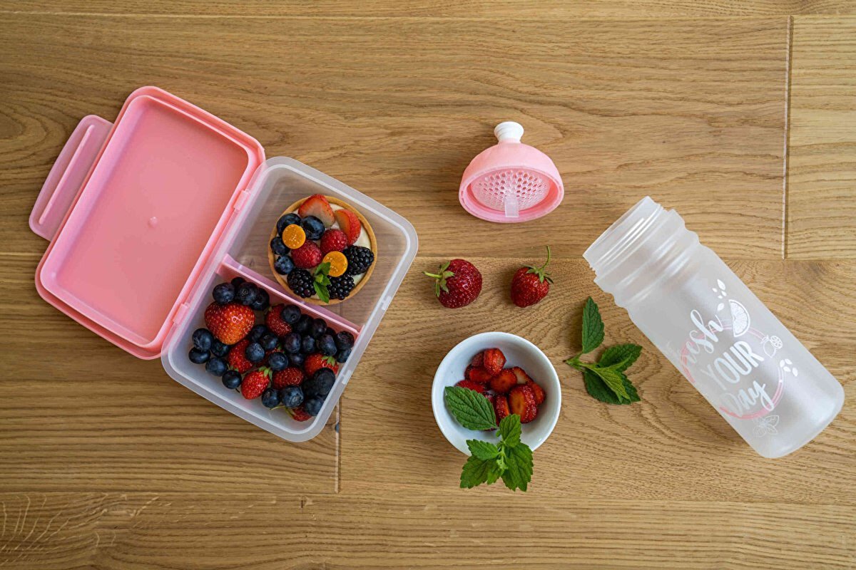 Balení obsahuje: box na svačinu, dětská lahev, shaker