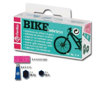 universální souprava na opravy plášťů, 3× záplata (1× 24×35 mm, 2× o 24 mm), 1× lepidlo, 1× smirek