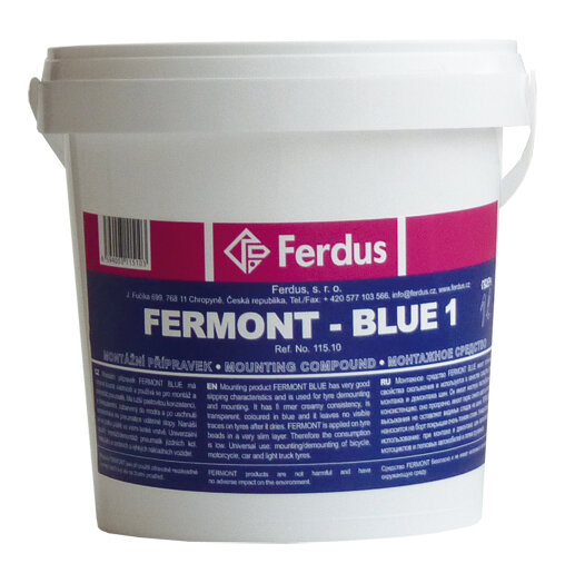 Montážní přípravek FERMONT BLUE má výborné kluzné vlastnosti a používá se jako prostředek pro montáž a demontáž pneumatik. Má tužší pastovitou konzistenci a proto se do něj aplikační štětec neponořuje. Je transparentní, zabarvený do modra a po uschnutí nezanechává na pneumatice viditelné stopy. FERMONT BLUE se nanáší na patku pláště ve velmi tenké vrstvě a proto je jeho spotřeba při práci nízká. FERMONT BLUE je univerzální, používá se při montáži a demontáži pneumatik jízdních kol, motocyklů a osobních a lehkých nákladních vozidel.