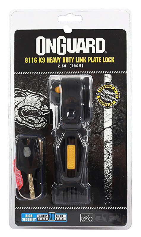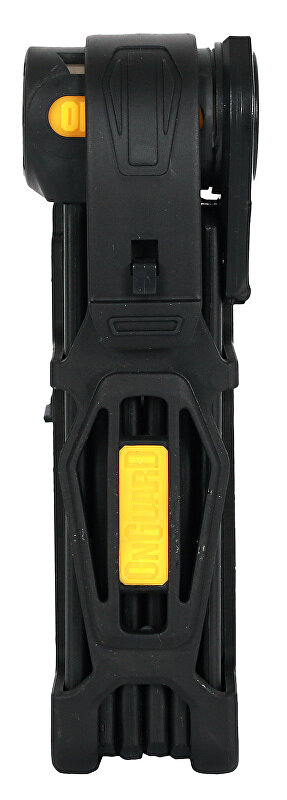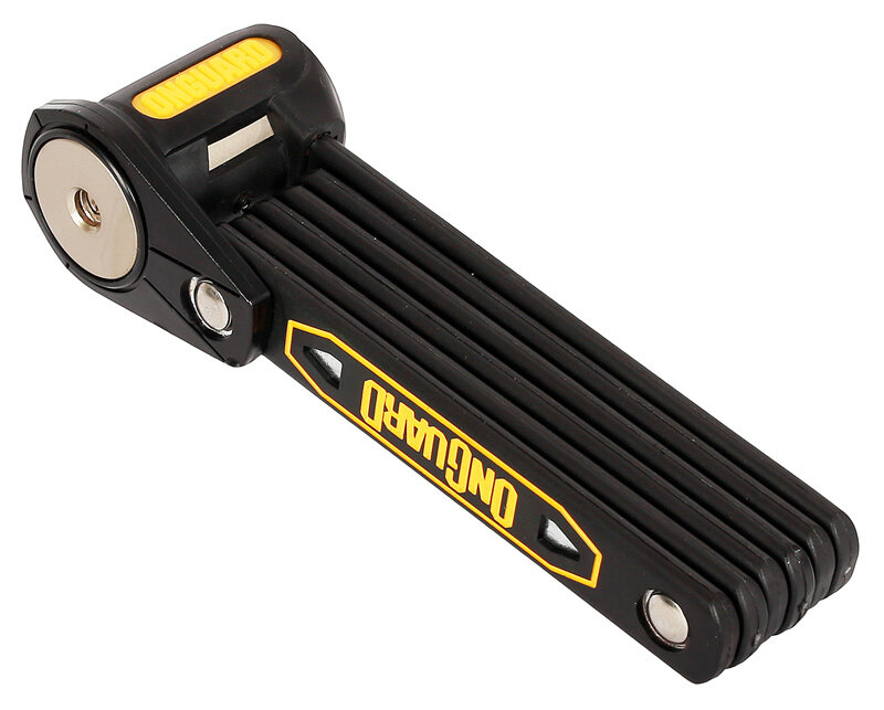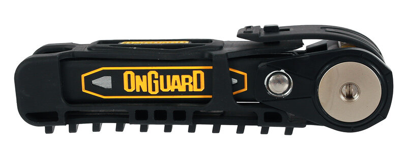 Efektivní, jednoduchý a vysoce účinný skládací zámek ONGUARD. Zámek je lehký, snadno použitelný a nabízí zabezpečení blížící úrovni U-zámků, ale s jednodušší manipulací, při menších rozměrech. Kalené články s dvojitým potahem plastu a žluté gumy dokonale chrání před odřením. Vhodný pro jízdní kola, motocykly, brány a další.