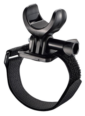 Plastový držák se na přilbu upevní páskou na suchý zip. Díky kloubu se dá se světlem vertikálně pohybovat.