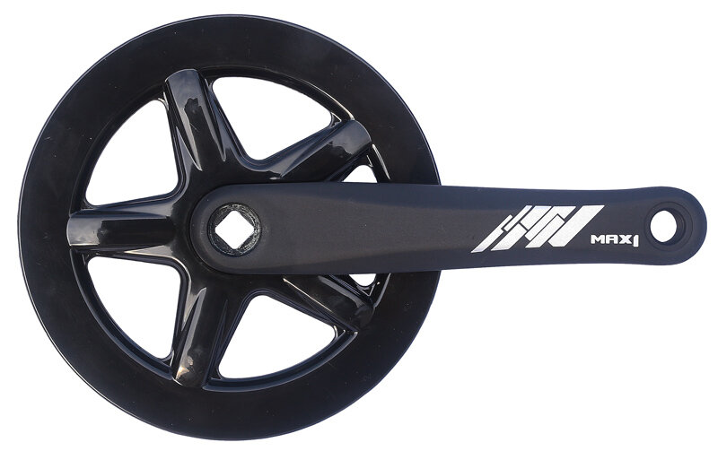 Kliky MAX1 Single s jednopřevodníkem určené pro městská kola. Matné Al kliky s ocelovým převodníkem a lesklým plastovým krytem.