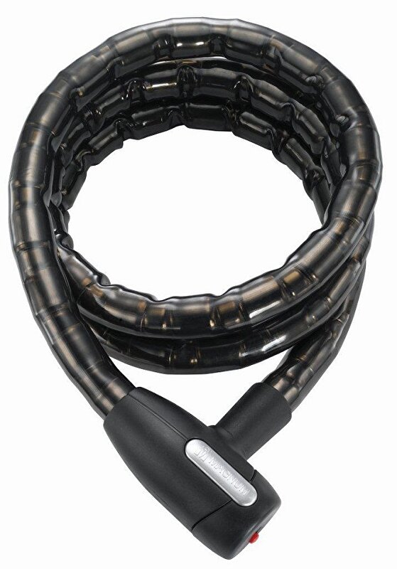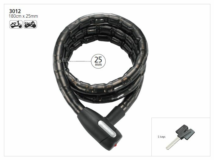 Tuhé ocelové lano je kryto hliníkovými články a tvrdým ochraným plastem a bezpečnostní hlavou, délka 1800mm a průměr 25mm, 5 klíčů. Hmotnost 1350 g.