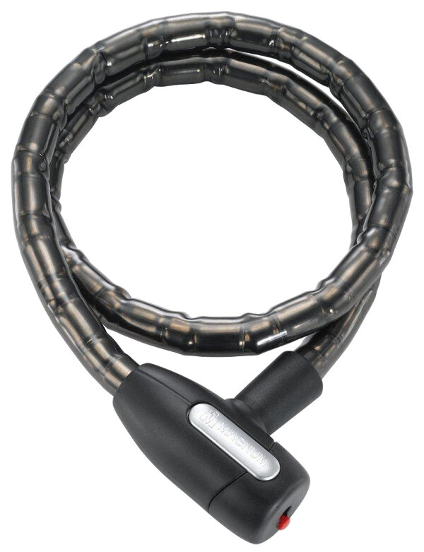 Tuhé ocelové lano je kryto hliníkovými články a tvrdým ochraným plastem s bezpečnostní hlavou, délka 1000mm a průměr 18mm, 5 klíčů. Hmotnost 680 g.