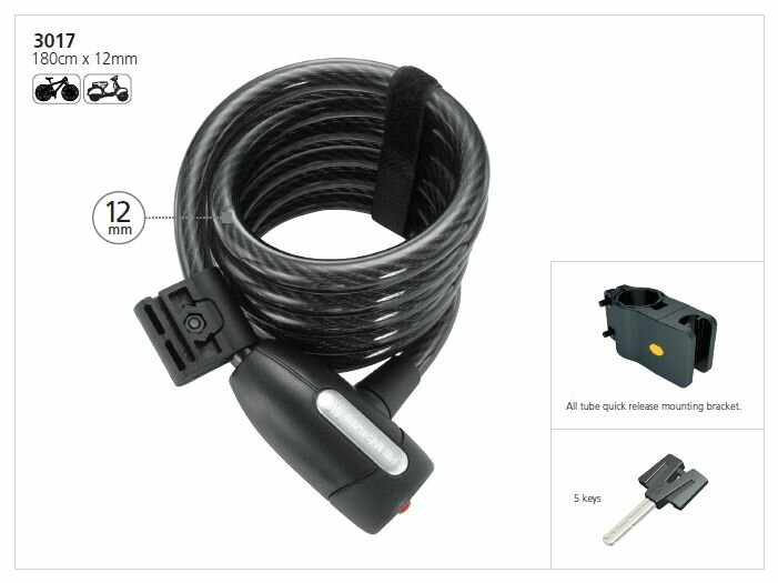 Lankový zámek MAGNUM, délka 1850mm, ocelové lanko 12mm, 5 klíčů, universální držák, atraktivní balení.