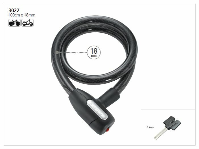 Extra GOLEM - tuhé ocelové lano o průměru 18mm! je kryto tvrdým ochraným plastem a velkou bezpečnostní hlavou, délka 1000mm a průměr 18mm, 5 klíčů. Hmotnost 820 g.