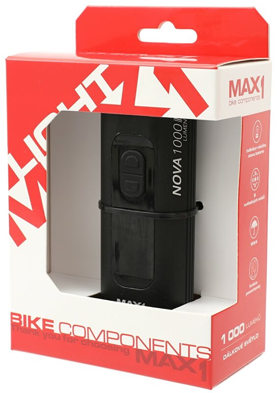 MAX1 Nova 1000 s vysokým světelným výkonem 1 000 lumenů. Díky pružnému gumovému popruhu světlo snadno přiděláte na každá řidítka. Pokud právě potřebuje doplnit energie v jiném dobíjecím zařízení, světlo MAX1 Nova můžete využít jako powerbanku a použít energii ze světla, třeba do vašeho chytrého zařízení.