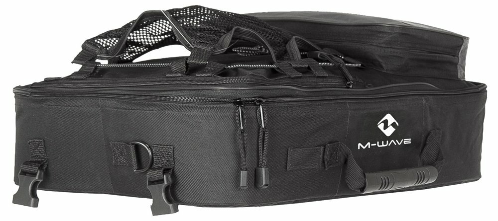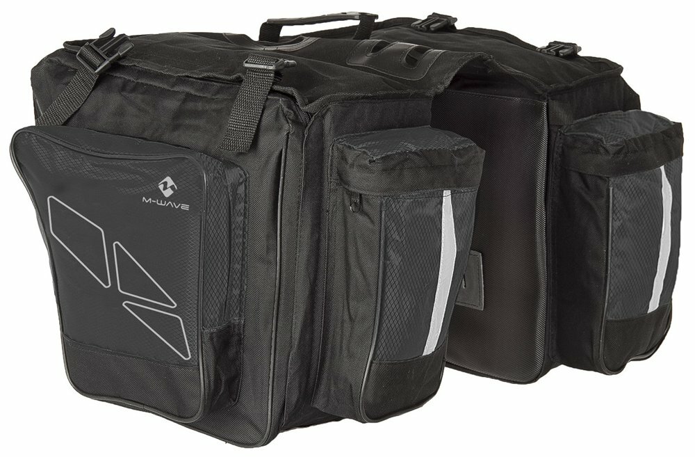 brašna na nosič M Wave s vynikající variabilitou a snadným uchycením na nosič, dvě postranní brašny jsou oddělitelné od vrchního dílu, obě samostatné části lze nosit odděleně v ruce nebo přes rameno, bezpečná konstrukce, kvalitní vodoodpudivý materiál, každá brašna má 1 hlavní a 1 vnější kapsu, objem 32 l, reflexní nášivky pro zvýšení bezpečnosti, vhodným doplňkem je pláštěnka na trojbrašnu z lehkého nepromokavého materiálu,