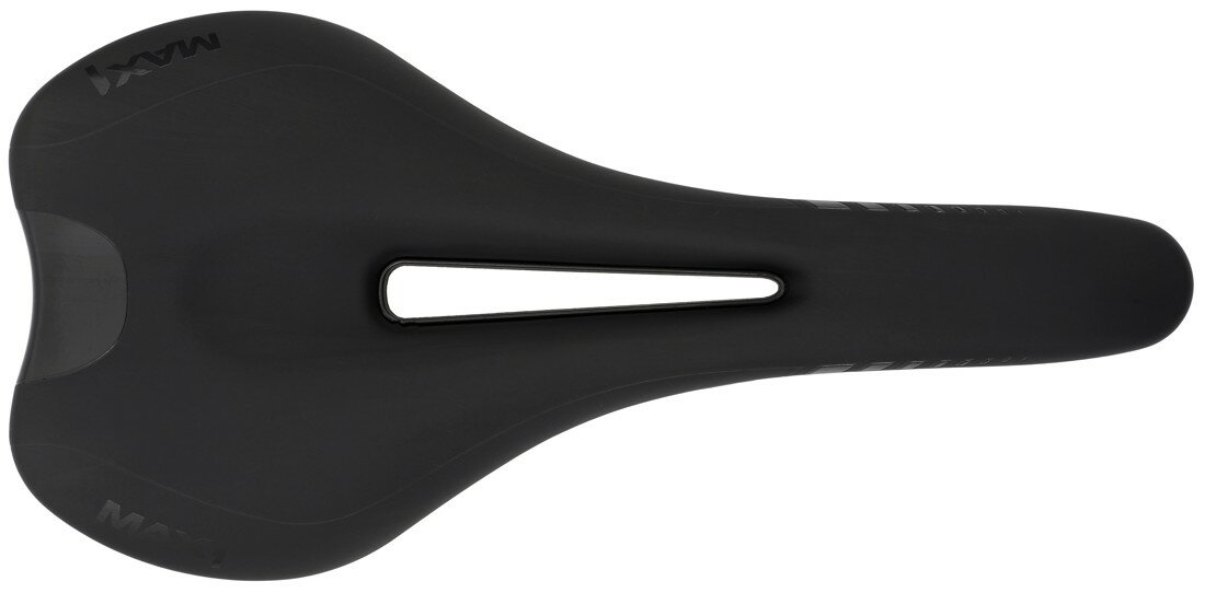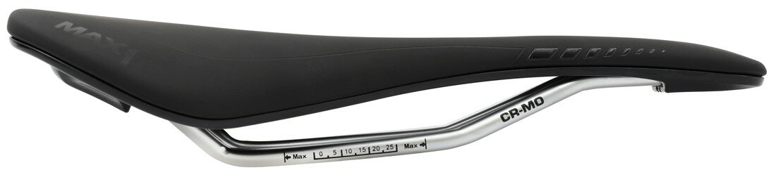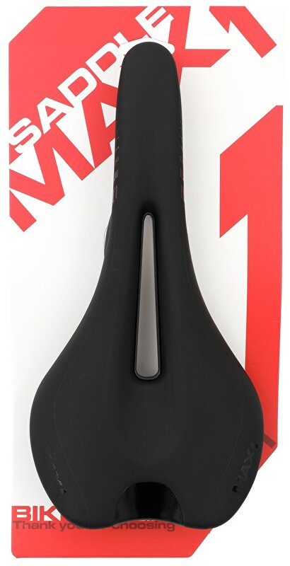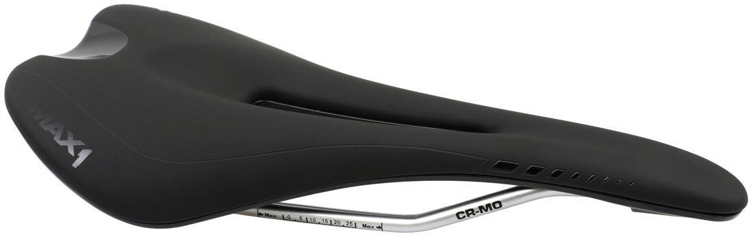 Závodní sedlo MAX1 Evo s Cr-Mo ližinami, nylonovou platformou a ergonomickým otvorem ve střední části.