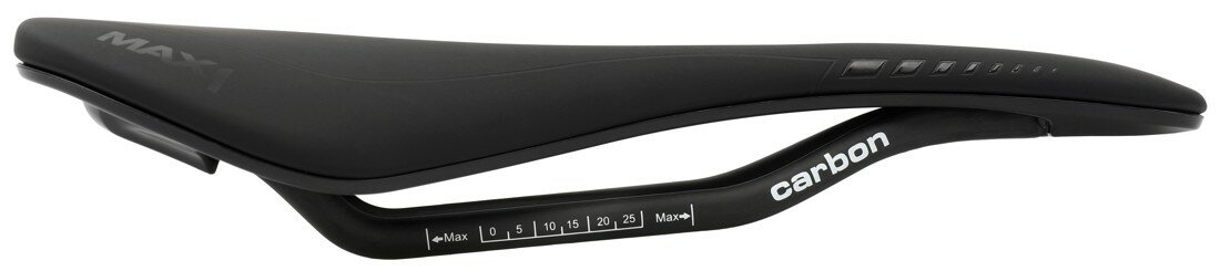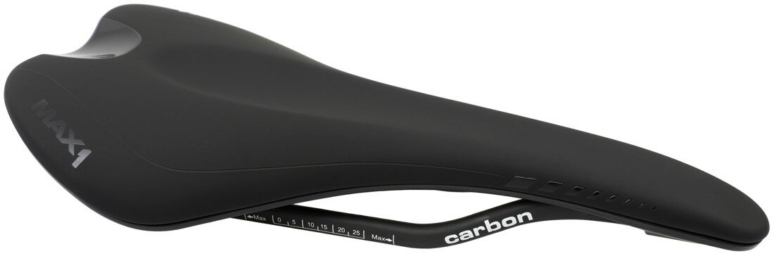 Závodní sedlo MAX1 Evo s karbnovými ližinami a karbonovou platformou.
