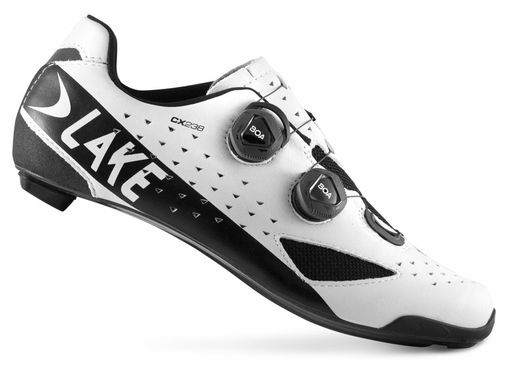 Závodní silniční tretry LAKE CX238 s dvěma upínacími systémy BOA a 100% karbonovou podrážkou Lake Race zajišťující požadovanou tuhost s optimálním přenosem síly na pedál. Svršek modelu je vyroben z kvalitní kůže s dlouhou životností zachovávající si vysokou prodyšnost a voděodolnost. V oblasti paty byl použit jednosměrný fleece zabraňující vyzouvání, který napomáhá udržet nohu na svém místě a předchází nechtěnému pohybu nohy v tretře.
