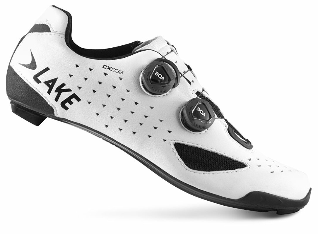 Závodní silniční tretry LAKE CX238 s dvěma upínacími systémy BOA a 100% karbonovou podrážkou Lake Race zajišťující požadovanou tuhost s optimálním přenosem síly na pedál. Svršek modelu je vyroben z kvalitní kůže s dlouhou životností zachovávající si vysokou prodyšnost a voděodolnost. V oblasti paty byl použit jednosměrný fleece zabraňující vyzouvání, který napomáhá udržet nohu na svém místě a předchází nechtěnému pohybu nohy v tretře.