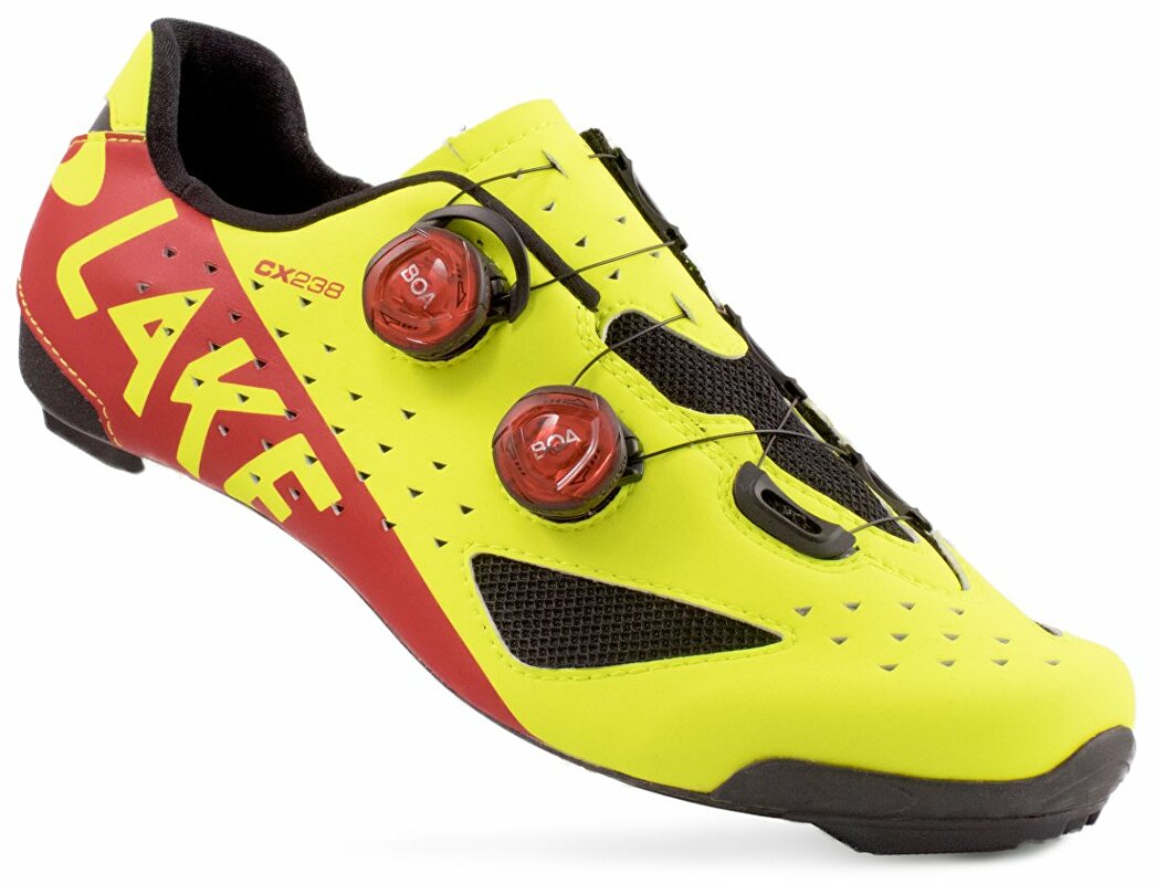 Závodní silniční tretry LAKE CX238 s dvěma upínacími systémy BOA a 100% karbonovou podrážkou Lake Race zajišťující požadovanou tuhost s optimálním přenosem síly na pedál. Svršek modelu je vyroben z Clarino Microfiber v kombinaci s kůží s povrchovou úpravou Helcor se zvýšenou odolností proti odření na exponovaných místech. V oblasti paty byl použit jednosměrný fleece zabraňující vyzouvání, který napomáhá udržet nohu na svém místě a předchází nechtěnému pohybu nohy v tretře.